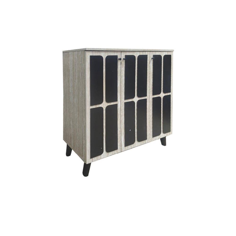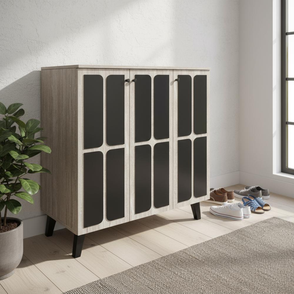 دولاب أحذية خشب ماليزي 3 درفة و4 أدوار باللون البيج والأسود، يجمع بين العملية والشكل الأنيق.