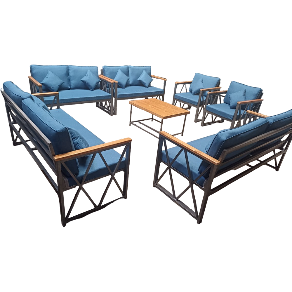 مردود السعودية طقم جلسات خارجية من الحديد مع الخشب الأوروبي الطبيعي مكون من 4 كنبة ثنائية + 2 كرسي + طاولة قهوة