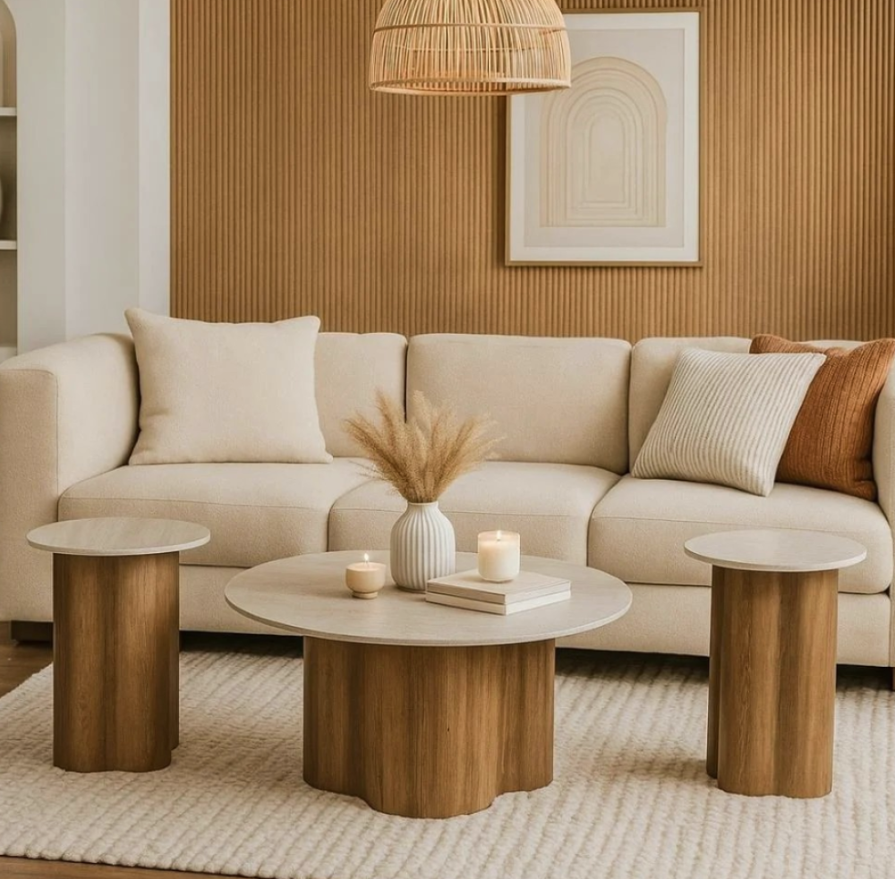 طقم طاولات خشبية بتدرجات البيج والبني، بأحجام متعددة لتلبية احتياجاتك المختلفة مع تصميم مودرن عملي.