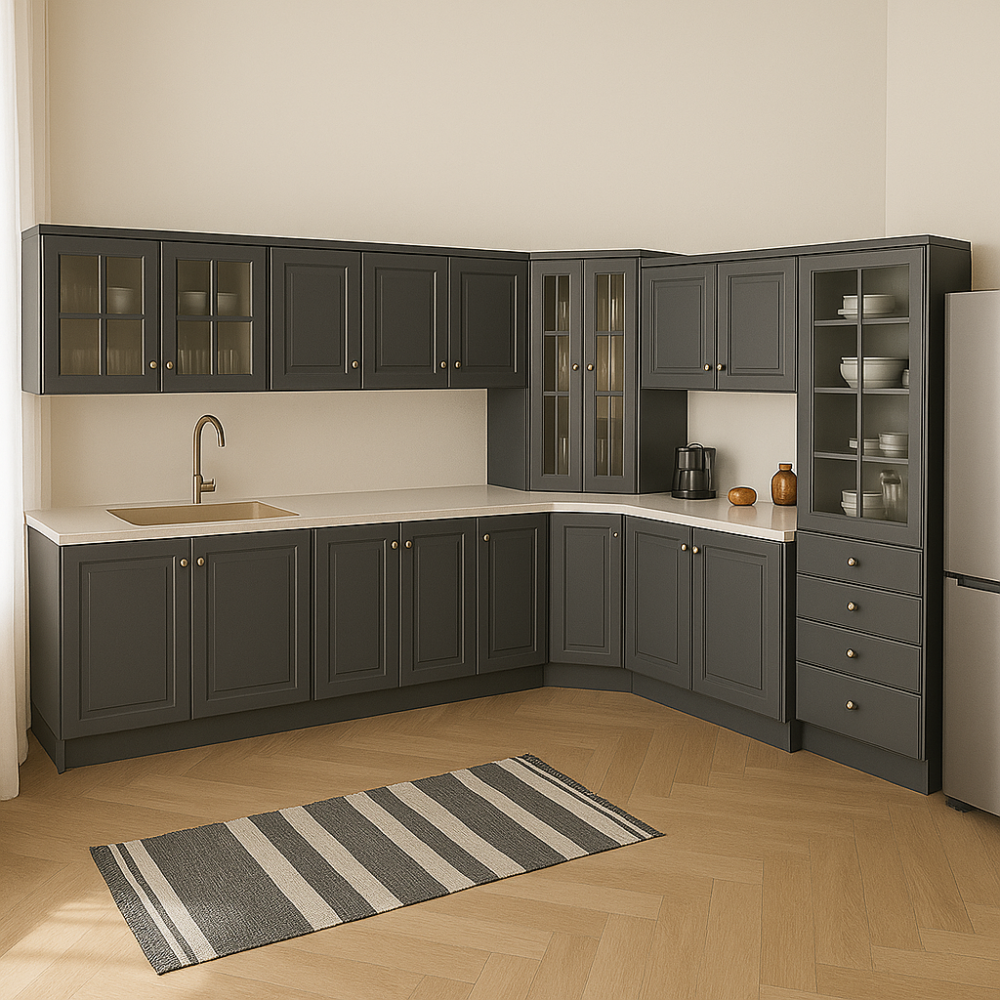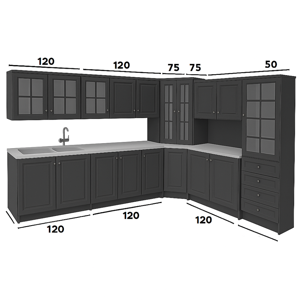 المطبخ عبارة عن قطع جاهزة، مكتوب مقاس كل قطعه بالصورة بحيث تقدر توزع اماكنهم بالمطبخ و يناسب الشكل الي تبيه