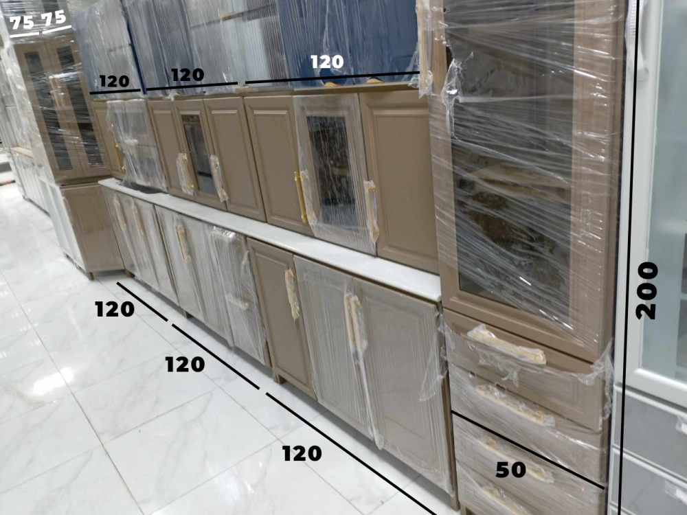 المطبخ عبارة عن قطع جاهزة، مكتوب مقاس كل قطعه بالصورة بحيث تقدر توزع اماكنهم بالمطبخ و يناسب الشكل الي تبيه
