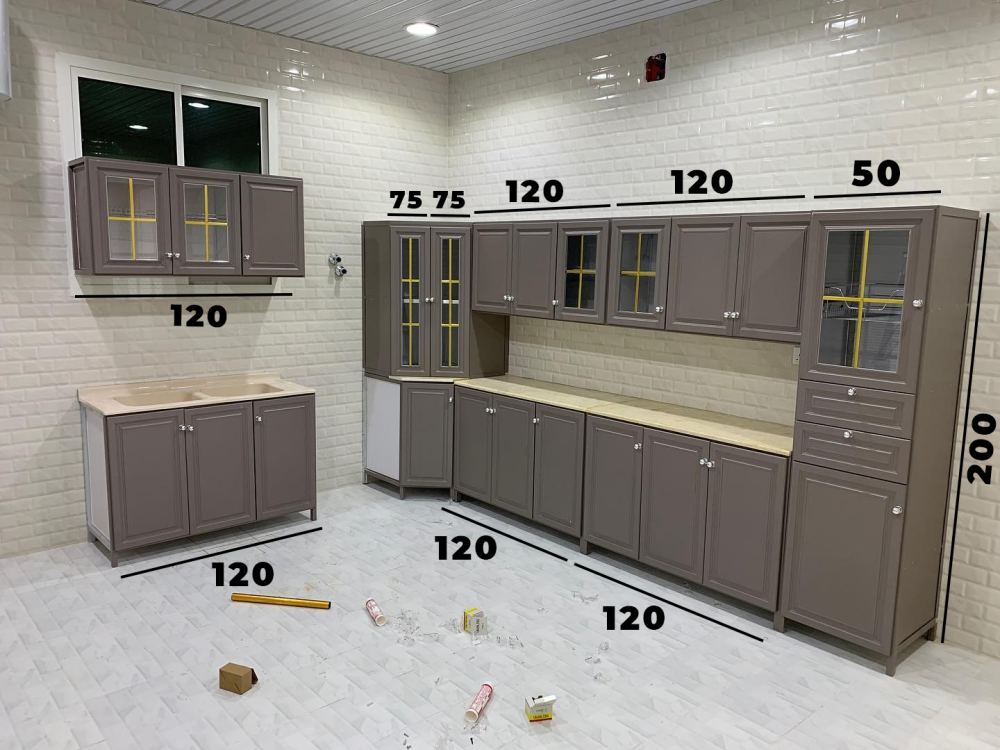 المطبخ عبارة عن قطع جاهزة، مكتوب مقاس كل قطعه بالصورة بحيث تقدر توزع اماكنهم بالمطبخ و يناسب الشكل الي تبيه